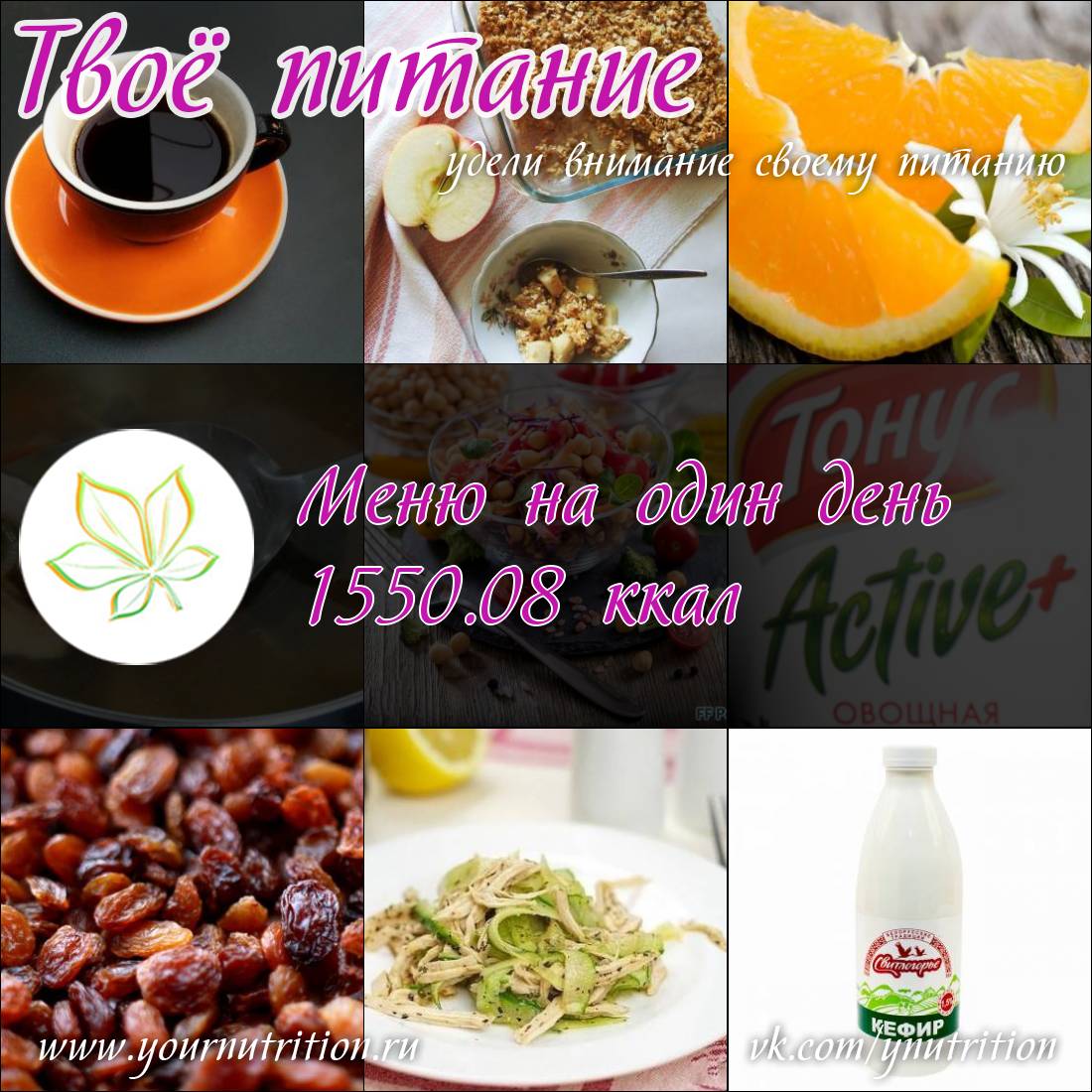 Диетическое меню на 1,5 тысячи килокалорий с основной массой углеводов в первой половине дня.